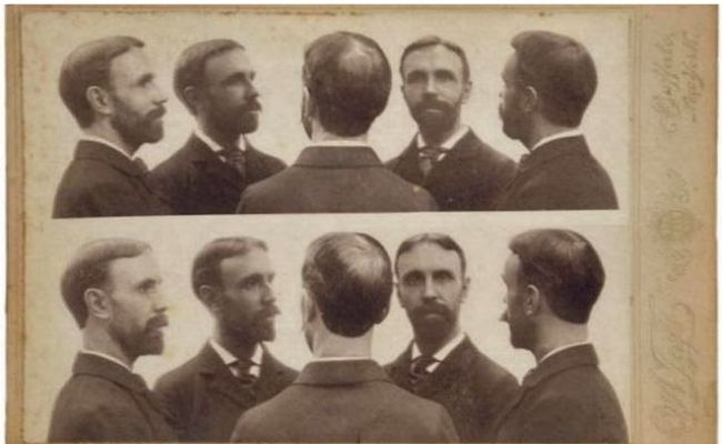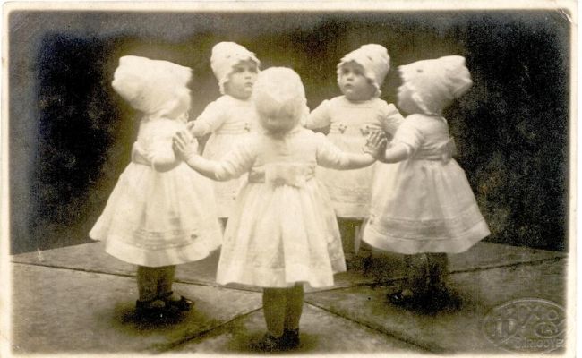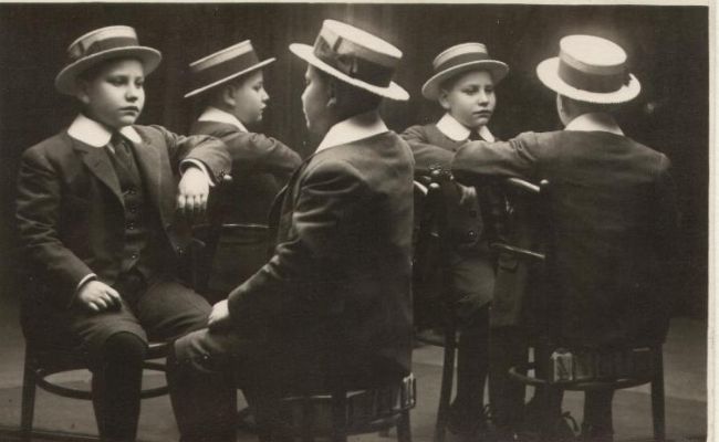 El retrato de Sam Auster presenta un curioso truco de espejos conocido como foto multígrafa, retrato múltiple o multifotografía. Irwin Reichstein (2007) nos dice que esta técnica fue empleada durante el apogeo de los estudios fotográficos de finales del siglo XIX, principalmente, como una novedad artística. Consistía en sentar a la persona fotografiada en medio de dos espejos, uno a lado del otro, con ángulos variados entre los 45 y los 180 grados; dependiendo la angulación, el reflejo de los espejos producía de tres a siete retratos en hasta cuatro o cinco poses distintas, todo por el precio de una (ver Figuras 2 a 7)7. De acuerdo con Reichstein, aunque la técnica gozó de cierta popularidad en fotógrafos amateurs y con algunos artistas de vanguardia, el truco perdió notoriedad hasta relegarse a suvenires de malecón. No obstante, existen registros no solo de fotografías múltiples en países como Italia, Argentina, Polonia, Estados Unidos, Rusia y Nueva Zelanda entre 1893 -supuesto año de creación- y hasta avanzada la tercera década del siglo XX, también los hay en libros y revistas especializadas tanto en ciencia como en arte fotográfico que mencionan la multifotografía como invención, moda o técnica fugaz (Reichstein, 2007).