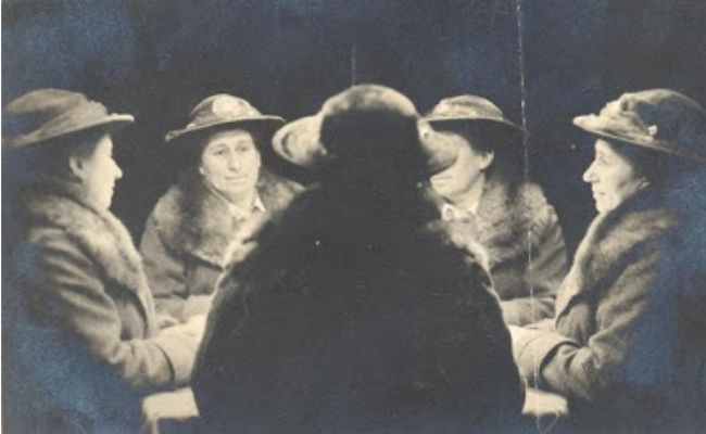 La edición de 1931 de Photographic Amusements a cargo de Walter Woodbury, originalmente publicada en 1896, registra que la foto multígrafa había tomado un nuevo impulso (citado en Reichstein, 2007). Paul Auster descubre la fotografía en 1979, la que dice que tuvo que haber sido tomada cuarenta años antes, es decir, a finales de los años treinta, coincidiendo con lo que asevera Woodbury. Desconocemos quién fue el autor, pero sabemos que fue tomada en un estudio fotográfico de Atlantic City, ciudad famosa, dicho sea de paso, por su malecón a no más de dos horas de Newark, Nueva Jersey, lugar de residencia de la familia Auster. Desconocemos también la intención -bien pudo haber sido el resultado de una excursión de fin de semana o un proyecto personal desconocido, como se anota en el ensayo-, pero es por demás sensato conjeturar que la fotografía presume al menos un poco de planeación.
