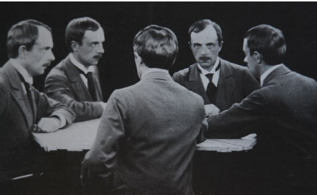 Conviene, llegados a este punto, hacer mención de la fotografía en la edición de Seix Barral. La portada del libro muestra a cinco hombres sentados en una mesa, todos con un ligero parentesco, todos mirando en direcciones distintas (ver Figura 1). Avanzada la lectura nos enteramos que en la fotografía no son cinco hombres diferentes sino uno sólo, Sam Auster, y que debido a un truco fotográfico la imagen se multiplica.