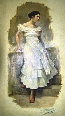 A pesar de que la mujer era considerada un objeto de complacencia, entre sus características prevaleció la sumisión, el apocamiento y el recato. Por consiguiente, la representación de “novia campesina” no se adecuó al prototipo de mujer costarricense a inicios del siglo XX, puesto que la posición de la mujer muestra sensualidad y se ubicó en un escenario de espera; por su parte, el vestuario no atañe a la indumentaria usual de la costarricense, el cual fue un atavío blanco y sumamente mesurado. En ese caso, el óleo sobre tela exportó el paradigma europeo y se ajustó a los vestuarios autóctonos de Andalucía (España) de donde procedía el artista.