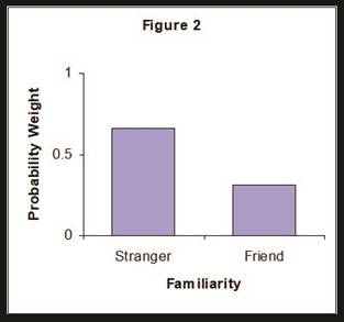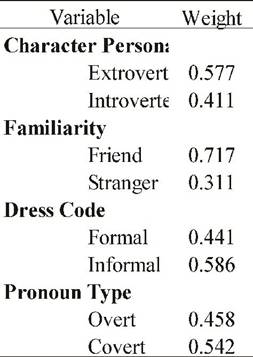 About character personality, if the character was Introverted, participants chose the usted form over the tú form with a weight of .784 and .278 respectively. Familiarity, as in previous studies (Rossomondo, 2002; Schwenter, 1993), seemed to influence speakers’ choice of this type. The form usted was used more frequently with strangers (e = .805) than with friends (a = .134). Similarly, dress code seemed to influence participant choices with formal wear attracting the usted form (f = .621) more than informal wear (i = .343).