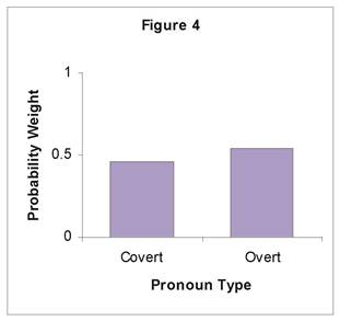 Regarding dress code, formal wear attracted the usted form more than the other two choices with weight of .569 and .400 respectively. The variable of the type of pronoun in the clause for the form usted overt pronouns seemed to attract it more than the other choices with weights of .541 and .459 respectively. Finally, for place of birth, participants from the South and from the West seemed to prefer the usted form, with weights of .679 and .564 respectively, more than participants from other regions (Mid-West = .499 and East = .395). The distribution of probability weights is shown in Figures 1 - 5.