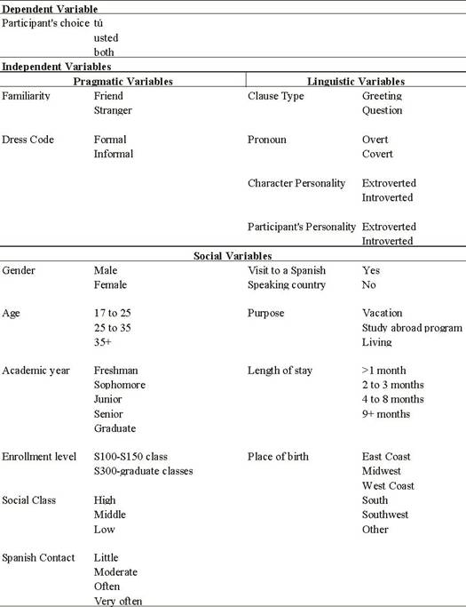 There were three choices: tú, usted, and either. The dependent variable was coded following previous L1 research in this area (Rehner, Mougeon, & Nadasdi, 2003) with a T for tú, V for usted, and B for either. Sixteen independent variables were included for the present study. Table 1 includes all variables used in the scenarios. The dependent variable is the participant’s choice of the pronoun of address. These independent variables were categorized as pragmatic, linguistic, social, and psychological in nature and are presented in Table 1 as well.