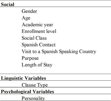 They included nine of the social variables, one linguistic variable, and one psychological variable. These variables are summarized in Table 2.