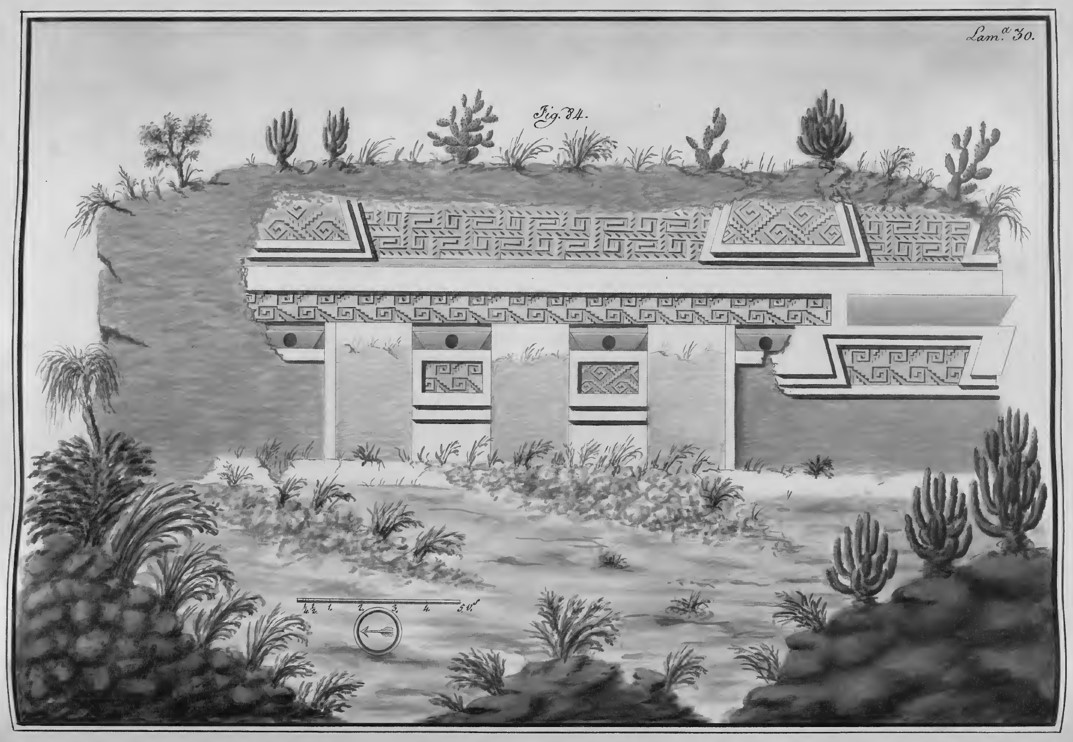 Las descripciones de Xochicalco, Mitla o Palenque son para Dupaix evidencia del desarrollo cultural de los indios, que en algunos casos le parece similar a los antiguos griegos y en otros superior al de los egipcios, tal como interpretaron antes los criollos. Respecto a Mitla, Dupaix (1831) refiere que su arquitectura y sus grecas “bastarían para darle entre todos los órdenes arquitectónicos conocidos, el rango más distinguido” (p. 264) y sobre sus tumbas afirma que: “ningún pueblo del antiguo Continente ha obsequiado con más ternura, a los cuerpos difuntos de sus parientes y amigos, que está nación Zapoteca” (p. 261), incluso ni siquiera los egipcios. Véase la Figura 14.
