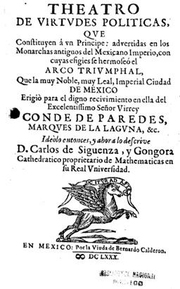 Una de las labores más interesantes de De Sigüenza fue realizar la primera excavación arqueológica en Teotihuacán (Bernal, 1992). A diferencia de quienes afirman que Thomas Jefferson fue quien la hizo, Daniel Schávelzon (1983) muestra que la de De Sigüenza fue la primera en América y que la utilizó como un método experimental para comprobar la hipótesis de que los montículos de tierra de Teotihuacán eran pirámides construidas por antiguos indios. El autor muestra también rasgos de la escolástica, cuando consideraba “que los mexicanos eran descendientes de Neftuim, sobrino de Cam, y estos antepasados habían salido de Egipto, por eso eran constructores de pirámides” (Hernández, 1992, p. 37). Sus estudios sobre la genealogía de los gobernantes mexicas se convirtieron en metáforas para expresar el “mexicanismo”. Carlos de Sigüenza fue encomendado en 1680 para realizar el programa iconográfico por el nombramiento del Virrey Paredes, uno de los grandes festejos del poder en la Nueva España. El autor escribió Teatro de virtudes políticas que constituyen a un príncipe advertidas en los monarcas antiguos del mexicano imperio y a partir de allí planteó que el arco triunfal elaborado para estas ocasiones se adornara con las efigies de los once emperadores mexicas, con Huitzilopochtli al centro, en lugar de las doce figuras clásicas occidentales que solían colocarse. Véase la Figura 1.