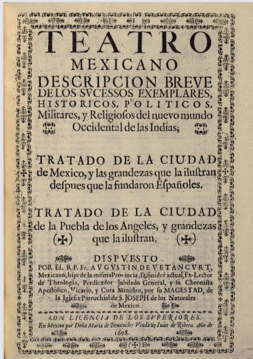 Agustín de Vetancurt (1870) recurrió a mapas y documentos antiguos para escribir Teatro mexicano, publicado en 1698, con la intención de compendiar lo conocido de la historia de la Nueva España por quienes estuvieron allí y la escribieron de primera mano y agregar nueva información para el desengaño, porque al ser habitante de ella sentía el compromiso de hacerlo (pp. XV-XVIII). Véase la Figura 2.