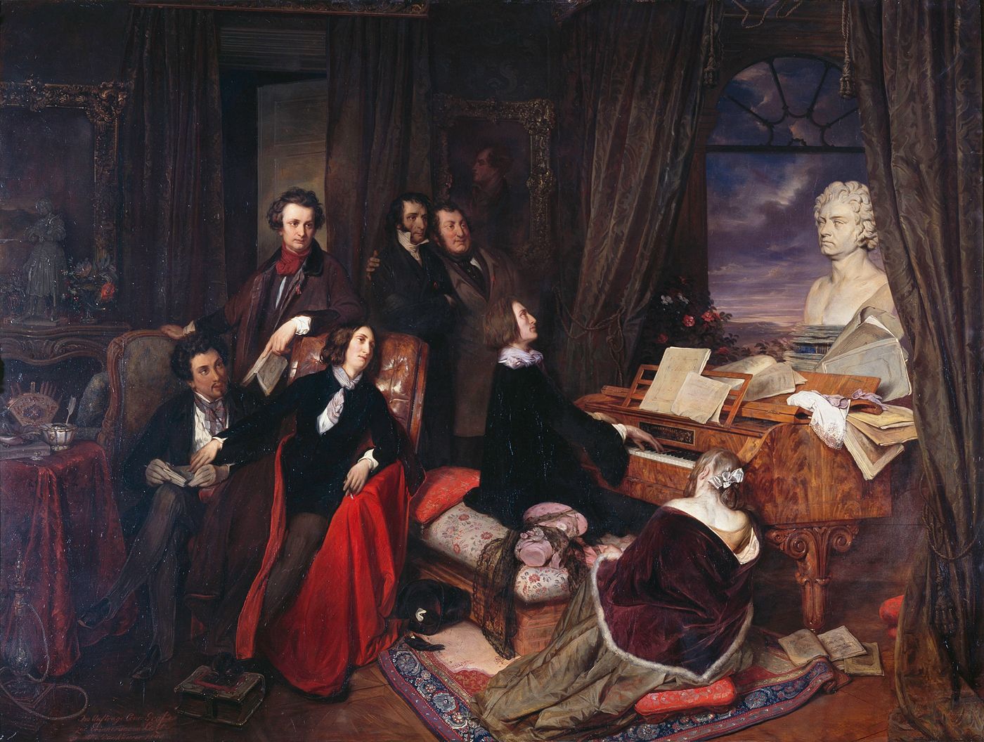 A pesar del manifiesto desorden de las partituras sobre la cola del piano, a los pies del busto ilustre –una exaltación romántica del poder de la música sobre el resto de las artes, solo se identifica aquella que reposa sobre el atril del piano, la que Liszt interpreta propiciando la admiración de sus invitados, la Marcia funebre sulla morte d’un Eroe –alegoría suprema de la pervivencia de Beethoven en un mundo futuro–, por un lado, ensayo previo de la Marcia funebre de la Heroica, por el otro, sello de despedida del compositor, cuya interpretación Stephan von Breuning encargó en los funerales de Beethoven, a los que el propio Danhauser había asistido muchos años antes, cuya honda impresión se mantuvo en el pintor hasta el final de su vida (1845) (Vela, 2020, p. 186).