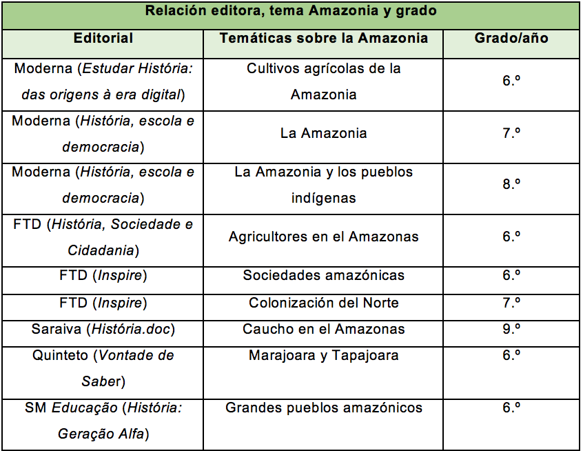 De los 40 libros, solo 9 mencionan la región amazónica. Cada una de las colecciones -Historia, escuela y democracia e Inspirar- presentan dos libros que mencionan la Amazonia. Tales narrativas ocupan, en promedio, 1 o 2 párrafos sobre la Amazonia. En dichos párrafos la región se presenta de forma genérica y como un área homogénea. Las narrativas se limitan a mencionar que hay rastros de presencia humana en la región que datan del periodo entre dos mil (Editorial SM Educação - História: Geração Alfa) y once mil años (Editorial Moderna - Estudar a História: das origens à era digital).