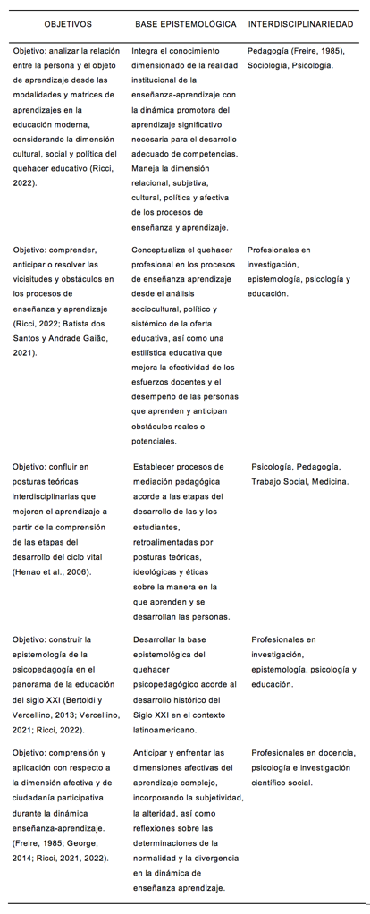 A partir de estas discusiones y teniendo en consideración lo que Ocampo (2020) advierte acerca del campo disciplinar de la psicopedagogía, cuando apunta que le “atraviesa una amplia gama de saberes, métodos, objetos, disciplinas, territorios, sujetos, influencias, teorías, etc.” (p. 13), surgen algunos de los objetivos que pueden orientar la enseñanza de la psicopedagogía como complemento de la formación en docencia.