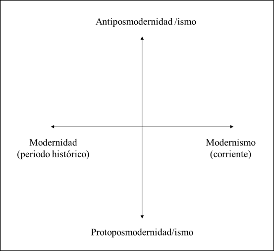 Sin embargo, las cualidades de esta actitud representan ante todo una postura crítica, por no decir distópica, de una realidad construida con fundamento irrestricto en el Estado, la ciencia y el mercado. Por esta razón, es indispensable conocer a profundidad los antecedentes sociales y teóricos de lo moderno, es decir, aquellos elementos tradicionales sobre los cuales se ha cimentado lo posmoderno ya sea positiva o negativamente. En otras palabras, comprender exhaustivamente el presente requiere la apropiación de cuatro componentes que abarcan una porción de la realidad determinada, que expresan una naturaleza teórica específica y que, aunque sean similares, poseen connotaciones sustanciales independientes: modernidad, modernismo, posmodernidad y posmodernismo.