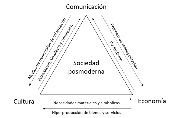 El triángulo de los elementos constitutivos de la sociedad posmoderna, junto con la cultura y la comunicación, se complementa con la economía. En líneas previas se expuso cómo las transformaciones de la cultura han llevado a la imposición de patrones de comportamiento que son reproducidos y transmitidos a través de los medios de comunicación. Ahora, es necesario analizar cómo se relacionan estos factores con la economía, en particular, cómo los acontecimientos económicos de las últimas décadas, sustentados especialmente en el capitalismo posindustrial y la implementación de políticas neoliberales, han moldeado y reforzado los paradigmas de lo posmoderno. Muestra de ello, por ejemplo, sería la forma en la que la economía ha promovido la cultura del consumo como un presupuesto inquebrantable del capitalismo o la manera en que se ha impuesto el dominio económico de las Redes Globales Multimedia en los mercados internacionales.