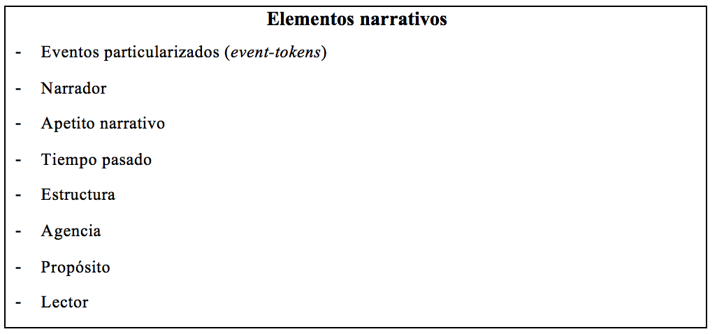 Los eventos particulares son ocurrencias particulares de una determinada clase. El narrador es el agente que relata una narrativa y puede estar puesto en primer o segundo planos. El apetito narrativo es el deseo creado en lectores y oyentes por saber lo que ocurrirá; se basa en un abanico de desenlaces posibles, lo que genera suspenso. El tiempo pasado implica que las narraciones conciernen siempre al pasado. La estructura remite a la presencia de complicaciones y su resolución. La agencia refiere a los actores (humanos u otros agentes morales) que causan y experimentan los eventos. El propósito es siempre ayudarnos a entender mejor el mundo. El lector, por último, debe interpretar el texto como una narracion para poder acercarse a él con las expectativas y previsiones adecuadas (Norris et al., 2005, p. 545s.).