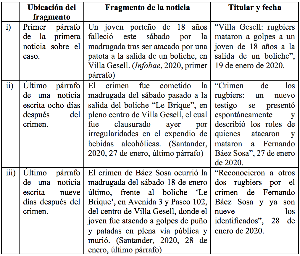 Así, si se analiza la cobertura digital que el portal de noticias Infobae hizo del asesinato del joven Fernando Báez Sosa a manos de una patota de rugbiers –actualmente detenidos y a la espera de una condena, que se presume será a prisión perpetua– en la madrugada del 18 de enero de 2020, un hecho que tuvo en vilo a la opinión pública argentina durante meses, hay un núcleo narrativo que permanece casi inalterado a lo largo de las muchas noticias dedicadas al tema. Este aparece ya en la primera de ellas. Se trata básicamente de la respuesta a las preguntas: qué, quién, dónde, cuándo y cómo, según puede notarse al revisar los fragmentos que incluimos en la Tabla 1. El primero, que no lleva firma, está extraído del primer párrafo de la primera noticia que el periódico dedicó al tema. Los otros dos están firmados por Alejo Santander: