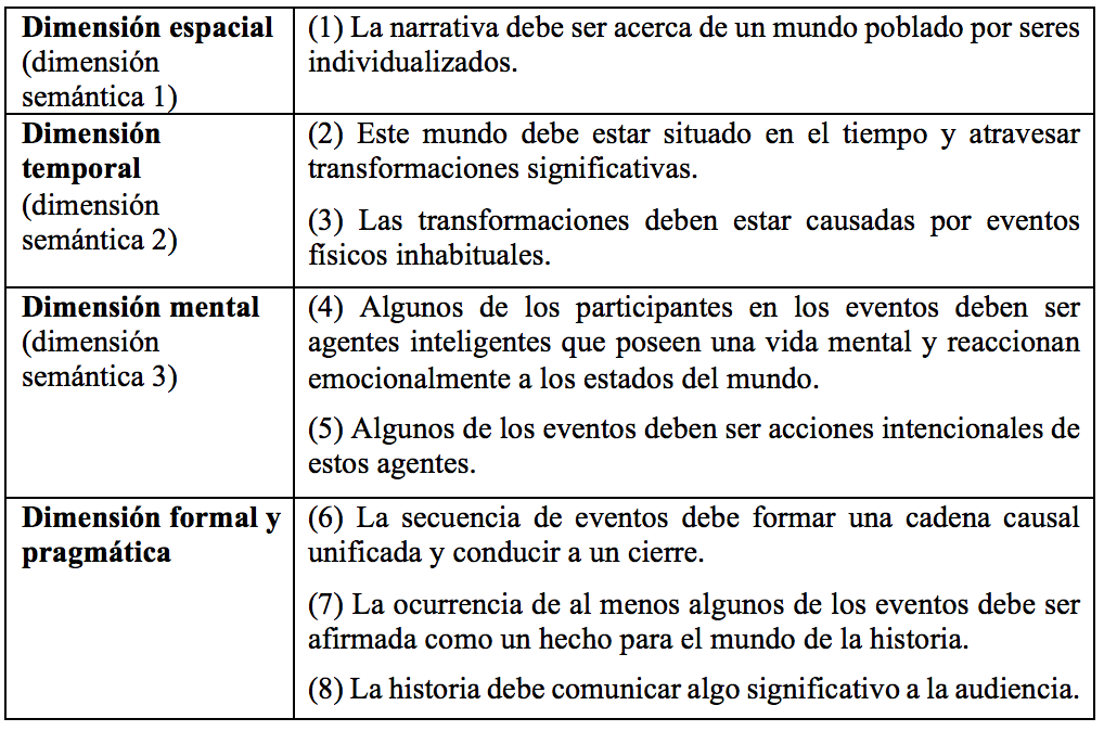 La historia puede ser más o menos “narrativa”, dependiendo del cumplimiento o no de una serie de condiciones. En concreto, Ryan propone ocho condiciones básicas de la narratividad de una historia (como puede verse en la Tabla 2). Un texto que transmite una historia las puede respetar en mayor o menor medida: así, habrá casos prototípicos, “que todos reconocen como historias” (Ryan, 2007, p. 28) y casos que solo algunos identifican como tales, en circunstancias muy específicas. Es por esto que la autora propone hablar del grado de narratividad de una historia, en contra de una aproximación dicotómica que se arrogue el derecho a determinar, de manera taxativa, que un texto dado sí o no es narrativo.