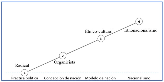 Todo esto constituye el fundamento con el cual cabe desarrollar una reflexión inductiva focalizada en la dependencia e interconexión que existe entre las categorías de análisis de esta investigación. Así, la radicalización de la marfilidad política en torno a factores objetivos de la estructura biológica u orgánica da cuenta de un modelo de nación enmarcado dentro del modelo étnico-cultural. ¿Por qué se afirma lo anterior? En el análisis de la construcción identitaria, la práctica política es un elemento fundamental que incide en las demás variables: concepción de nación, modelo de nación y nacionalismo. Por consiguiente, si la construcción identitaria se manifiesta por su carácter radical, significa que esta excluye y se opone a la concepción voluntarista, es decir, una considera a la otra como su contraparte; de esta manera, el modelo de nación cívico-político se opone al étnico-cultural.