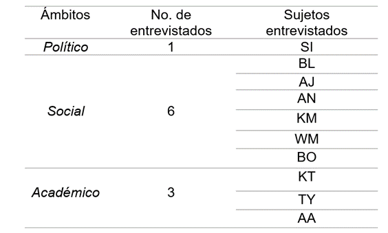Por una parte, la repartición de las personas entrevistadas en función de los ámbitos referidos resaltó sin duda por una desproporción numérica que se explica sobre todo por lo sensible que ha constituido para la población el tema de la marfilidad en Costa de Marfil: la mayoría de las personas contactadas se negó a prestarse para la entrevista. Por lo tanto, con base en un criterio de conveniencia, se trabajó con aquellos sujetos que se mostraron accesibles y disponibles y que, por ende, aceptaron realizar la entrevista. Por otra parte, con la finalidad de entender con precisión las implicaciones de las perspectivas y percepciones de los sujetos entrevistados en función de los ámbitos establecidos, se hizo —en la Tabla 1 que se presenta a continuación— una referenciación sistemática que permitiera identificar, en cada uno de los casos, el ámbito desde el cual se dieron las respuestas.