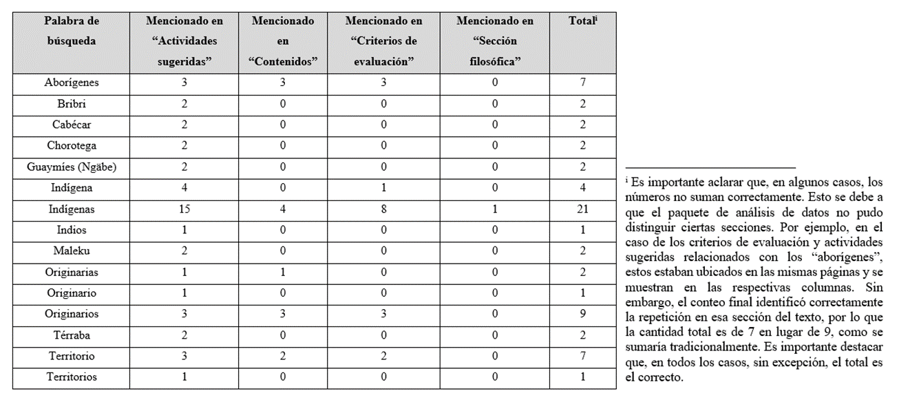 En la forma que el Estado aborda el mundo indígena, se puede observar que el enfoque no profundiza en la realidad de estos pueblos. Por ejemplo, a lo largo del documento, no se utilizan las palabras “territorio” e “indígena” juntas. En la Tabla 3, se puede apreciar claramente la cantidad de veces que se utilizan diferentes denominaciones para estos grupos étnicos y, sobre todo, la falta de conexión entre la frecuencia de la palabra “indígena” en el apartado filosófico y en otras secciones del programa. Esto demuestra la ausencia de consenso por parte de las autoridades ministeriales en la materia Estudios Sociales para la elaboración de un programa integral que aborde adecuadamente la temática indígena.