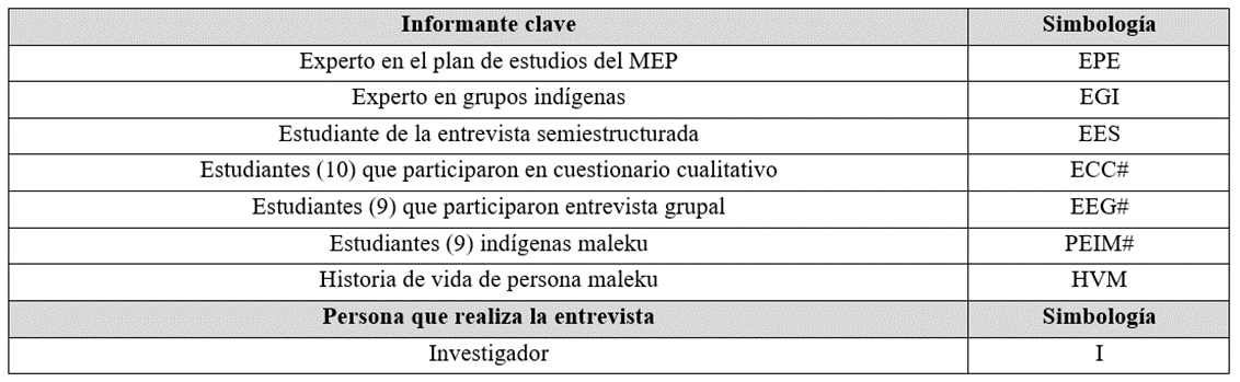 Con la intención de ordenar la información recopilada, este apartado se dividió en tres secciones. En primer lugar, se presenta la información sobre el programa del MEP (2016); posteriormente, se muestran los resultados recopilados de las encuestas y entrevistas con las personas estudiantes del CTP de Zarcero; y en tercera instancia, se expone la autorrepresentación de personas indígenas maleku. Para respetar el anonimato y manejar éticamente la investigación, en la Tabla 2 se muestra la simbología para representar las referencias de las personas informantes clave: