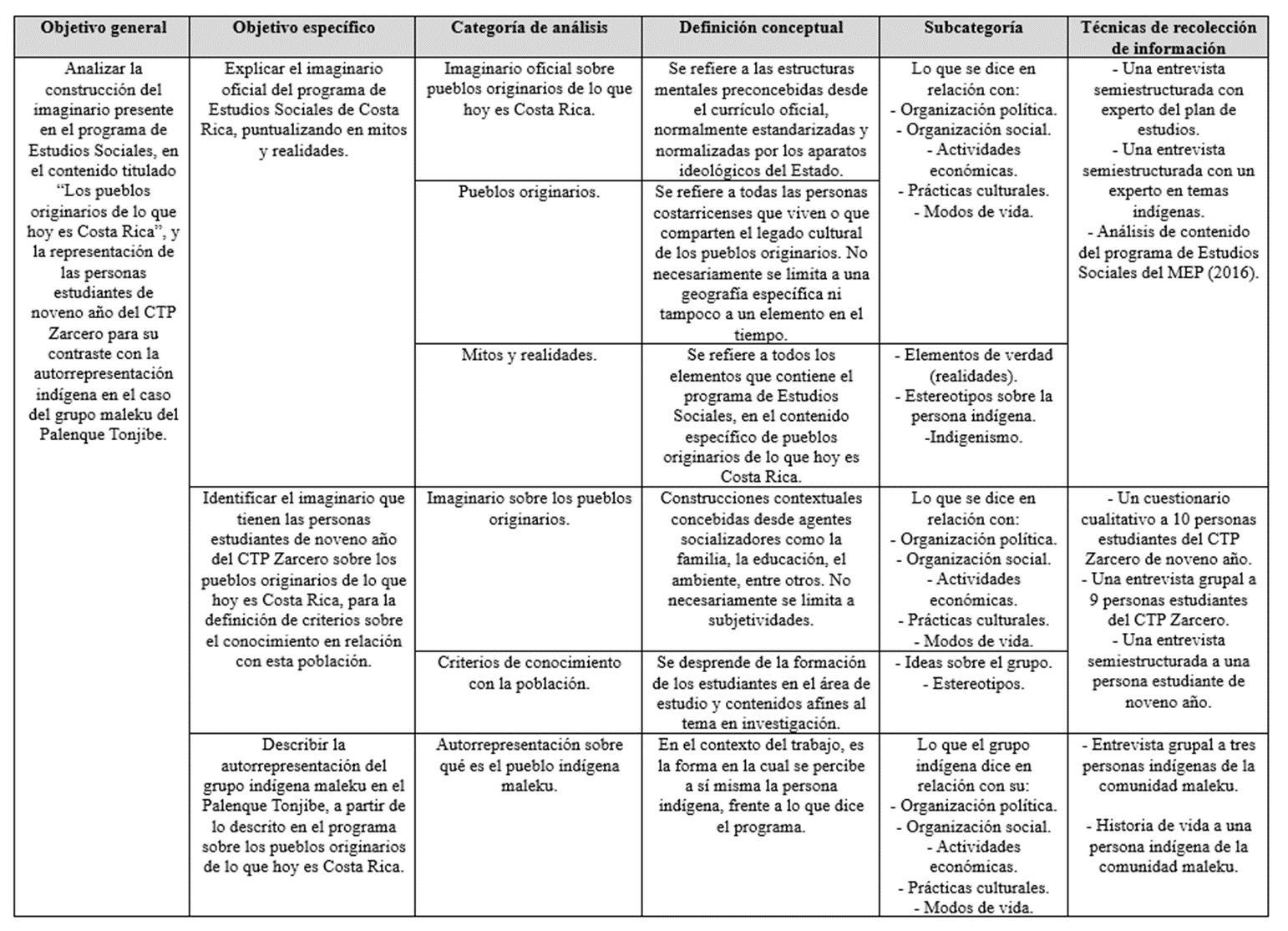 Para la recopilación de información, los informantes clave se clasificaron en tres grupos: el primero de ellos fue el de expertos, constituido por dos individuos: uno situado en el currículo oficial, por ser asesor de Estudios Sociales de la Regional de Occidente del Ministerio de Educación Pública (MEP); y el otro, quien destaca por especializarse en temáticas de los grupos indígenas costarricenses, cuyos aportes se evidencian por su desarrollo académico en el área y la cantidad de investigaciones y publicaciones en el tema. El segundo grupo de informantes claves correspondió a veinte estudiantes de noveno año del Colegio Técnico Profesional de Zarcero, los cuales habían conocido el territorio maleku durante una salida de campo. Finalmente, se seleccionaron a cuatro personas del grupo indígena maleku. Con el fin de recopilar toda la información obtenida, esta investigación utilizó una serie de técnicas y categorías de análisis que se sistematizan en la siguiente Tabla 1: