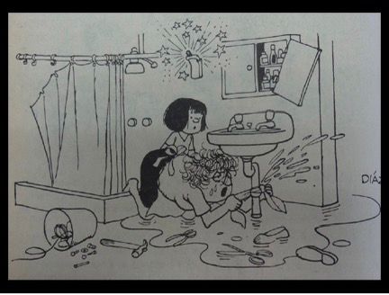 La Figura 1 presenta una escena en la que el padre está realizando labores en una caótica cocina mientras intenta cuidar a sus hijos, quienes demandan su atención. De manera similar, en la Figura 2, vemos a una mujer intentando, sin éxito, arreglar la tubería de un baño sucio y desordenado. Su expresión refleja cansancio, tedio y resignación, mientras que la hija, ubicada detrás, observa la situación con confusión. En contraste, en la Figura 3, se muestran dos escenas donde tanto el padre como la madre están desempeñando, de manera conjunta, labores tradicionalmente asociadas con lo femenino (planchar la ropa) y lo masculino (usar herramientas y hacer arreglos en la casa). La hija y el hijo se muestran felices imitando a sus padres.