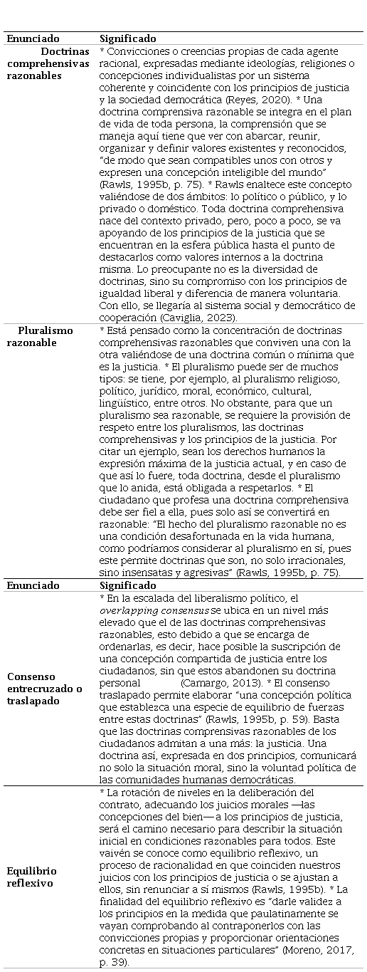 Visto lo anterior, en lo que sigue de esta sección, se procura explicar algunos conceptos de la teoría rawlsiana que giran en torno al hecho del pluralismo razonable: