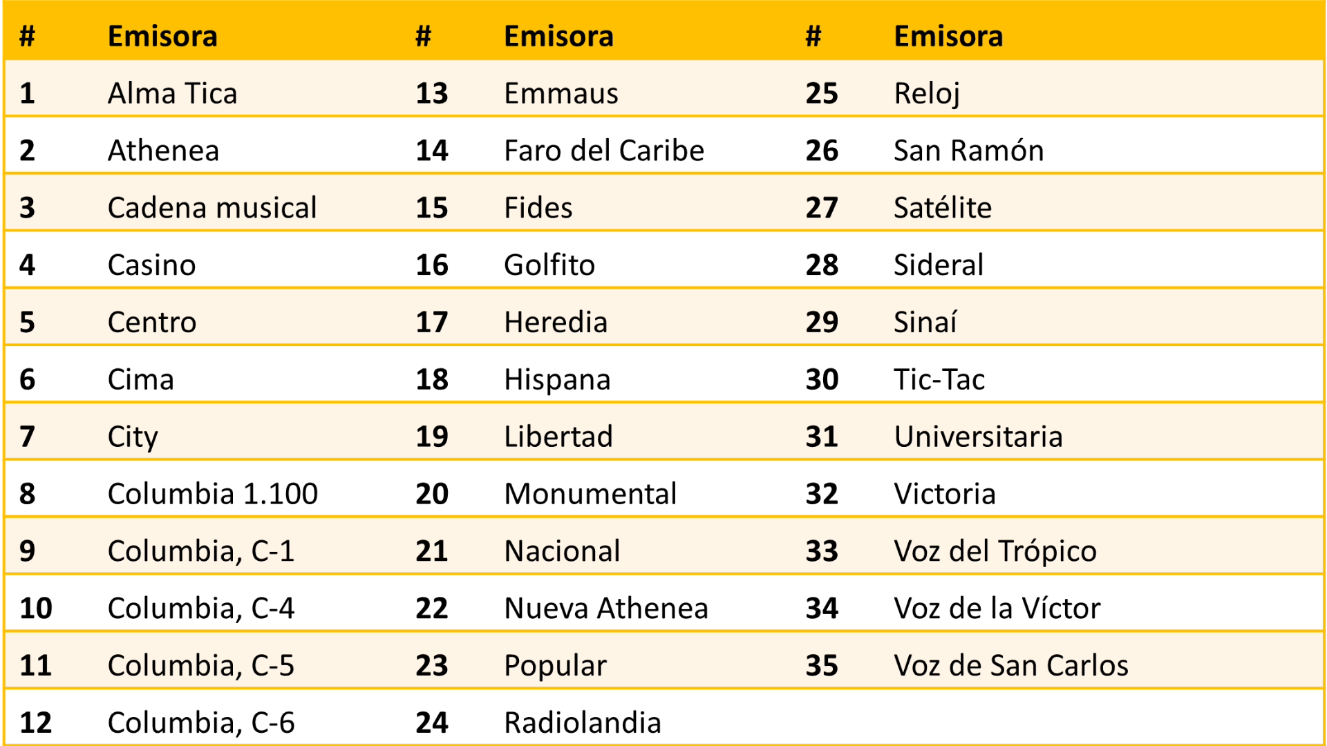 Ese mismo año se llevaron a cabo algunos esfuerzos para realizar acuerdos con más radiodifusoras de la capital, de manera que, en la década de 1960, un total de 35 estaciones de radio de todo el país colaboraron en dicho convenio (Tabla 1). No obstante, pese al apoyo divulgativo, se presentaron problemas en el Departamento de Extensión Cultural debido a la falta de equipo de grabación, por lo que no se podía aumentar la oferta ni los programas se podían grabar anticipadamente, lo que limitaba la labor del Departamento (Gámez, 1958; Vargas, 1966).