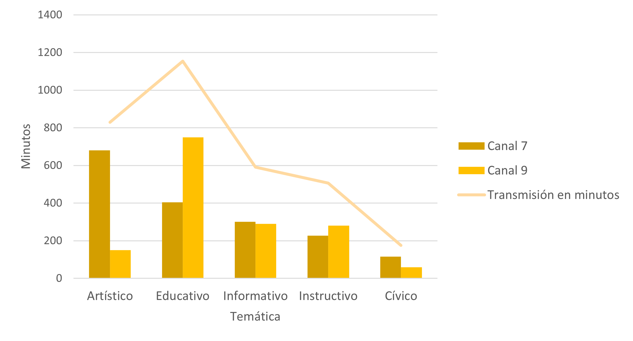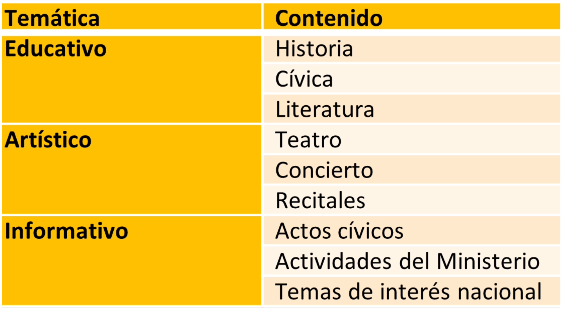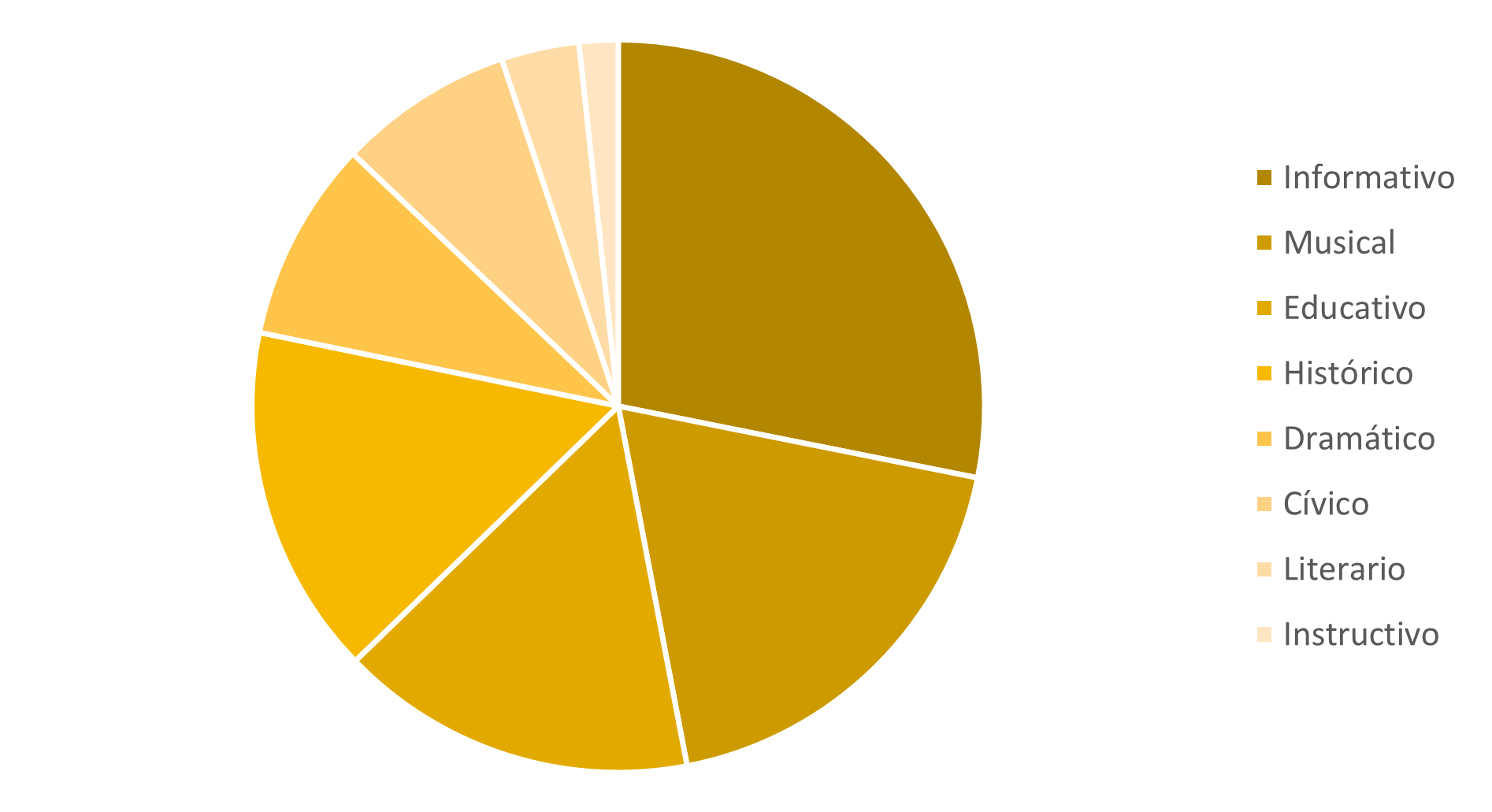 En la Figura 1, se muestran los temas abordados en los programas, así como la duración que se dedicaba a cada una de las transmisiones. Los programas informativos, es decir, aquellos que se enfocaban en actividades asociadas al ministerio, ocupan el primer lugar con un 28 % del tiempo empleado en las emisiones, mientras que los musicales, con un 19 %, estaban en el segundo y los educativos en el tercero con un 16 %. Por su parte, la transmisión de contenidos históricos y cívicos, en conjunto, abarcaba un total de 405 minutos, lo cual los sitúa en segundo lugar con un 23 % del tiempo.