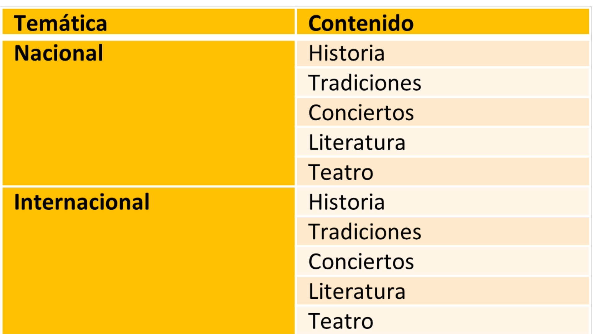 De esta forma, se puede observar un cambio en las temáticas abordadas y, con ello, una modificación en la división temática. Tal y como se observa en la Tabla 3, se pasa de tres ejes a dos: se elimina el tercer tópico, el informativo, con énfasis exclusivamente en aspectos del ámbito cultural, por el hecho de que el MEP seguía cubriendo temas de interés nacional y actos cívicos.