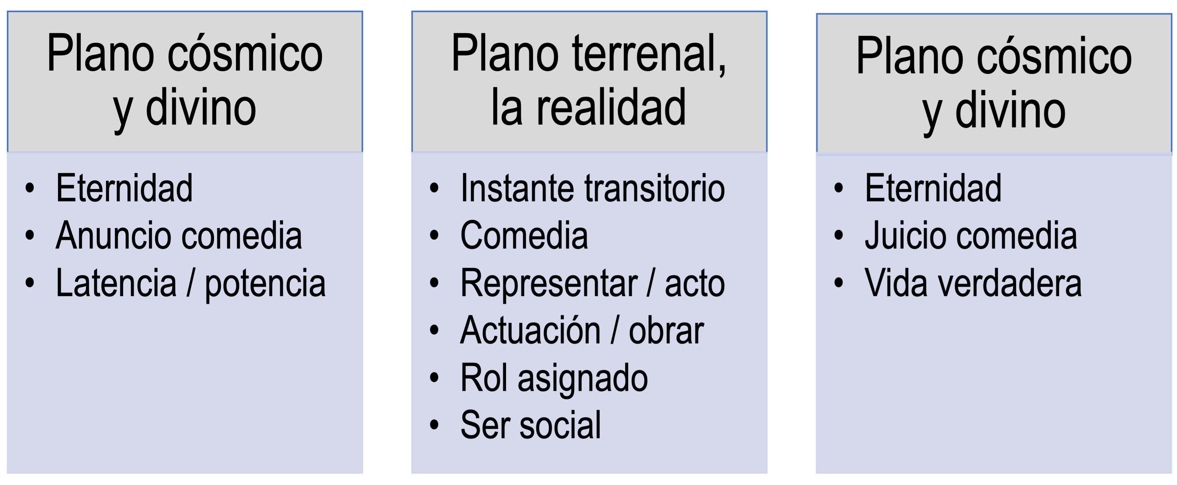 Se trata de un auto sacramental, publicado en 1655 y, considerando la clasificación de sus autos en función de su carácter (Valbuena Prat, 1957; Parker, 1968), tiene características de aquellos a los que se asigna una dimensión teológica, filosófica, dogmática, moral, pero también ética, pues trata del bien vivir en los planos individual y colectivo, en consonancia con el dogma cristiano. Presenta tres “jornadas”, aunque el texto no sigue esa convención2 . Esta cuestión de la estructura ha sido objeto de debates intensos en tanto se puedan considerar, a nivel literario e incluso escénico, cinco, cuatro, o tres momentos. Los argumentos son, en cada caso, convincentes, si bien aquí se optará por la consideración de tres fases en el curso de la acción, tres secuencias en dos planos diferentes, correspondiendo la primera y la tercera al cósmico, y la segunda al terrenal o real, como muestra la Figura 1.