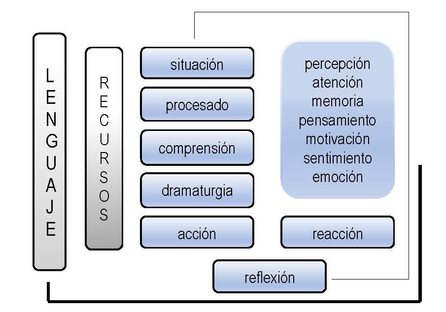 El actuar implica acción y esta se genera en función de cada situación. Para actuar, el sujeto ha de comprenderla, siquiera de forma intuitiva, al activar procesos muy sustantivos que se suceden de forma casi instantánea y lo son de percepción, atención, memoria o pensamiento, tamizados por el lenguaje en una comunicación intrapersonal (Lucas Marín y García Galera, 2009), pero también de análisis, evaluación y toma de decisiones. Supone construir una intención y convertirla en acto y el sujeto ha de contar con un determinado potencial expresivo, creativo y comunicativo, con la finalidad de que su proyecto de dramaturgia se desarrolle adecuadamente y se adecue a sus propósitos y a las respuestas de los otros, pues su actuación se enmarca en un flujo de acción-reacción, en tanto la interacción implica actuaciones simultáneas de varios sujetos. Cada sujeto define y redefine objetivos y expectativas en función de los cuales se diseñan y adaptan, sobre la marcha, dramaturgia y actuación, en un proceso permanente de reflexión y evaluación de la acción en la acción.