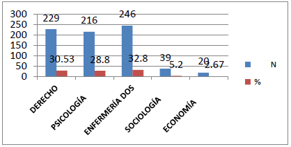 Los estudiantes que contestaron las preguntas acerca de los factores psicosociales que determinan el Bajo Rendimiento Escolar (BRE) fueron en total 750, que equivale al 100 % de los participantes. De ellos, 30.53 % (229) estudia la licenciatura en derecho, 28.80 % (216) está matriculado en la carrera de psicología, 32.80 % (246) cursa enfermería N° 2, 5.20 % (39) estudia sociología de la comunicación y 2.67 % (20) cursa la licenciatura en economía (gráfica 1).