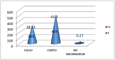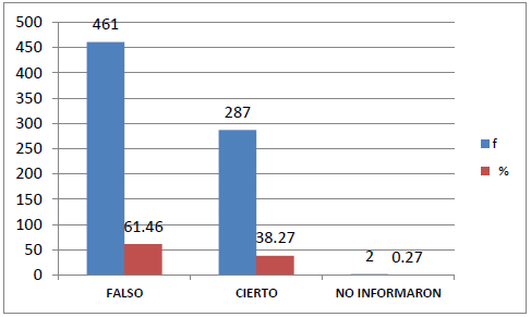Los contenidos educativos pueden representar para varios estudiantes una dificultad para continuar y culminar su carrera, por eso se interrogó a los discentes si los temas difíciles pueden devenir en un BRE. Los registros de campo se analizan a continuación: 61.46 % (461) de los encuestados opinó que es falso , 38.27 % (287) dijo que es cierto y 0.27 % (2) no contestó la pregunta. Se puede redondear y decir que 6 de cada 10 estudiantes universitarios no tienen problemas en los temas difíciles de sus clases, así que este factor no genera el BRE (gráfica 10).