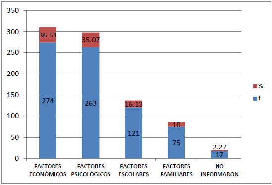 El primer bloque de tres factores, señalados con el número 1 y que ejercen una mayor influencia en el bajo rendimiento escolar, son: la desmotivación del estudiante , la falta de recursos económicos y la indiferencia del educando por su aprendizaje, ya que registraron 21.29 % el primero, 17.82 % el segundo y 15.96 % el tercero.