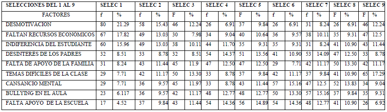 El cuadro número 1 que concentra los resultados globales aportados por los estudiantes de las licenciaturas de derecho, psicología, enfermería N° 2, sociología y economía, los cuales fueron entrevistados para aplicarles el cuestionario, permite establecer las interpretaciones en general acerca de las relaciones intrafactoriales de tipo psicosocial que influyen en el bajo rendimiento escolar. Se solicitó a los participantes que clasificaran del 1 al 9 los siguientes factores: desmotivación del estudiante, indiferencia del estudiante, temas difíciles de la clase, desinterés de los padres, falta de apoyo de la escuela, bullying en el aula, cansancio mental, falta de recursos económicos y falta de apoyo de la familia. Ellos debían escribir el número 1 al factor que más influye, el número 2 al que influye menos y así sucesivamente, hasta escribir el número 9 al factor que, desde su punto de vista, no influye o influye menos en el Bajo Rendimiento Escolar.
