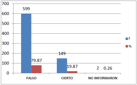 Una de las conductas psicosociales abordadas en la presente investigación fue el desinterés de los padres, por lo que se preguntó a los entrevistados si este factor influye en el Bajo Rendimiento Escolar de sus hijos. Las respuestas a dicho ítem fueron las siguientes: 79.87 % (599) contestó que es falso , 19.87 % (149) expresó que es cierto y 0.27 % (2) no informó . Como se puede observar, el mayor porcentaje de entrevistados niega que el desinterés de los padres influya en su bajo rendimiento escolar. En la gráfica número 2 se pueden visualizar los datos referidos.