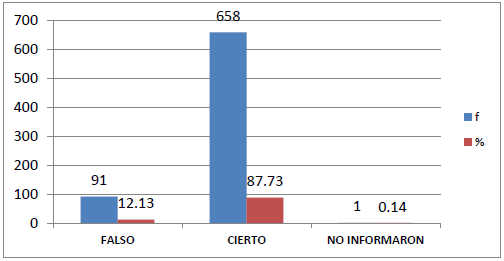 A los encuestados se les preguntó si la desmotivación es un factor que influye en la existencia del Bajo Rendimiento Escolar; los datos registrados son los siguientes: 12.13 % (91) expresó que es falso , 87.73 % (658) contestó afirmativamente y 0.14 % (1) no proporcionó información . Estos registros son mensajes que los estudiantes envían tanto a las autoridades de las escuelas visitadas, como a sus padres para que ambos inicien la implementación de medidas que disminuyan los porcentajes obtenidos y el bajo rendimiento escolar (gráfica 3).