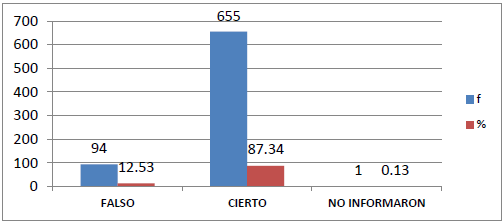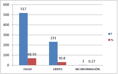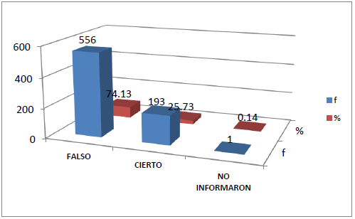 Otro indicador asociado al BRE es la falta de apoyo de la familia, que impide que los jóvenes estudien una carrera y puedan rendir con calificaciones sobresalientes, expresadas en dígitos de nueve y diez. En una escala oficial que va del 0 al 10, en la UAGro la cifra mínima aprobatoria es de 7, tanto en el nivel medio superior como en el superior. Al revisar las respuestas de los cuestionarios se encontró que 74.13 % (556) eligió la opción falso , 25.73 % (193) se inclinó por la opción cierto y solamente 0.14 % (1) no proporcionó información (gráfica 7).