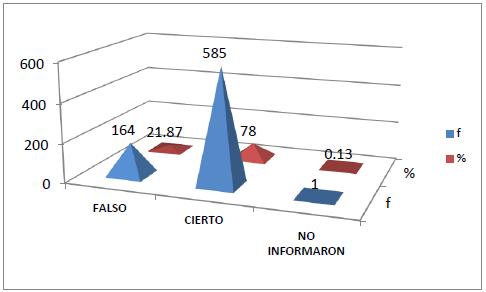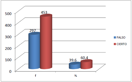 Después de preguntar a los estudiantes si el cansancio mental determina la presencia de Bajo Rendimiento Escolar, ellos respondieron con falso y/o cierto: 39.60 % (297) contestó que es falso, 60.40 % (543) dijo que es cierto . Esto permite deducir que la mayoría de los educandos consultados acepta que el cansancio mental está asociado al BRE (gráfica 5).