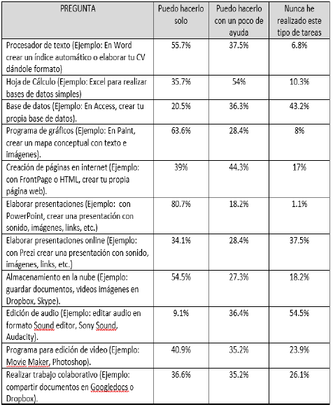 Al revisar los resultados, se puede identificar que 42.76% de los estudiantes puede utilizar diferentes software solos, 36.65% que puede utilizarlos con un poco de ayuda y 22.42% que nunca ha realizado este tipo de tareas; información que permitirá planear su aprendizaje a un nivel intermedio o experto, con base en los lineamientos para certificación de Microsoft en cuanto a herramientas de ofimática y en cuanto a las programas que no han tenido oportunidad de aprender, al igual que, planear actividades teórico-práctica para su aprendizaje y buscar el desarrollo de competencias con su uso.