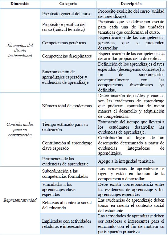 En la educación basada en competencias el estudiante debe demostrar lo que aprendió, por lo que las evidencias, definitivamente, se convierten en las aportaciones que hacen los alumnos, en las pruebas fehacientes que comprendieron y aprendieron, en los productos o resultados (demostraciones objetivas y pertinentes) del desempeño; en otras palabras, el estudiante demuestra que es capaz de hacer lo que la competencia en cuestión enuncia ( Ruíz, 2009; Goñi, 2008). Para identificar y evaluar el grado en el que el estudiante está desarrollando competencias, se necesita evaluar su desempeño y, para tal efecto, se requiere formular indicadores por niveles de dominio. Estos permiten medir en forma más objetiva el desempeño de los estudiantes a medida que vayan realizando evidencias de aprendizaje y, al mismo tiempo, permiten definir umbrales óptimos de logros esperados ( Unesco, 2015; Tobón, 2010). Por lo tanto, el diseño de evidencias de aprendizaje cobra gran relevancia. Desde la perspectiva de Reyes (2018), existe una serie de aspectos que hay que tomar en cuenta para el diseño de evidencias de aprendizaje, al respecto propone un modelo conformado por tres dimensiones de las cuales se derivan un total de trece categorías. La propuesta antes mencionada se resume en la tabla 1.