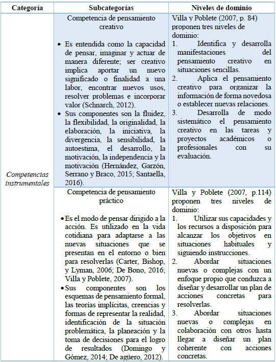 En el proyecto Tuning América Latina (2013) se consensuan 27 competencias genéricas; mientras que Villalobos (2009) y Villa y Poblete (2007) mencionan 35, agrupándolas en competencias genéricas instrumentales, interpersonales y sistémicas. En este documento se abordarán concretamente dos de las competencias instrumentales: las de pensamiento creativo y las de pensamiento práctico.