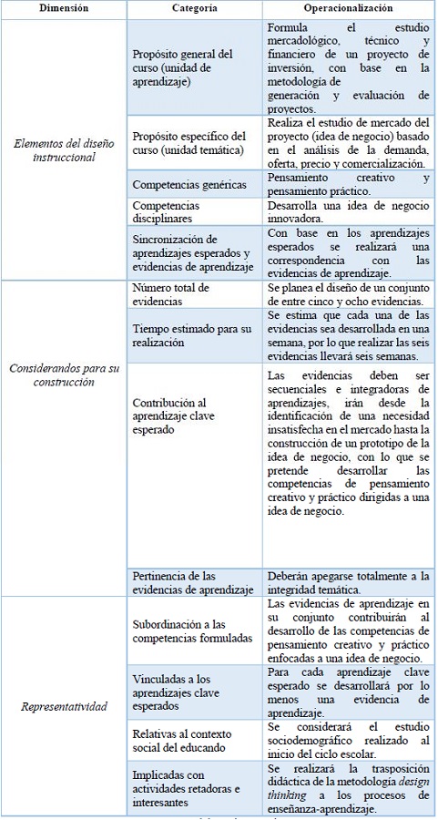 Asimismo, las evidencias están enfocadas al logro de los aprendizajes descritos en la unidad temática II (Estudio de Mercado) de la unidad de aprendizaje Administración de Proyectos que se imparte en la Escuela Superior de Cómputo del Instituto Politécnico Nacional. Para su diseño, se tomaron en cuenta las cuatro dimensiones con sus respectivas categorías propuestas por Reyes (2018), tal y como se aprecia en la tabla 3.