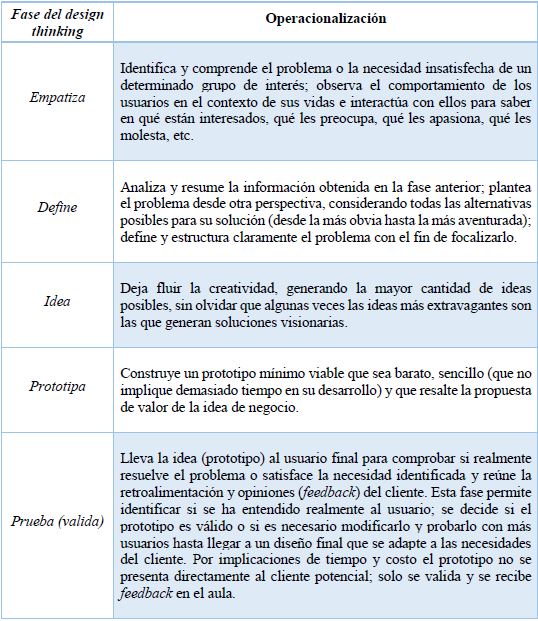 Y finalmente, bajo la premisa de que el design thinking es una de las metodologías más reconocidas de innovación, se retomarán las fases mencionadas por Rattinger (2015); de tal modo que los estudiantes transiten por cada una de ellas con el propósito de generar una idea de negocio innovadora (véase tabla 4).