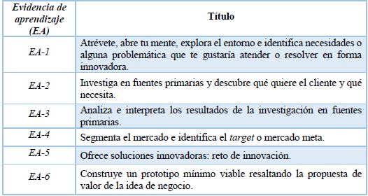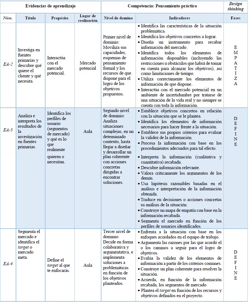 En este trabajo se retoma la conceptualización de competencia, de enseñanza, de aprendizaje e innovación y se propone un conjunto de seis evidencias de aprendizaje con integridad temática, generadoras de competencias de pensamiento creativo y práctico, potenciadoras e integradoras de diversos aprendizajes significativos y dirigidas a generar ideas de negocio innovadoras; con lo que se responde a uno de los criterios del enfoque educativo por competencias: los estudiantes deberán demostrar, bajo cierto contexto, un desempeño determinado. Adicionalmente, con las evidencias propuestas, se logró la transposición didáctica de la metodología design thinking a los procesos de enseñanza-aprendizaje, consiguiendo conectar y sincronizar dicha metodología con el estudio de mercado de un proyecto de inversión. De forma paralela, para medir el desempeño, se establecieron tres niveles de dominio con sus respectivos indicadores para el desarrollo de competencias de pensamiento creativo y práctico para iniciar un plan de negocio.