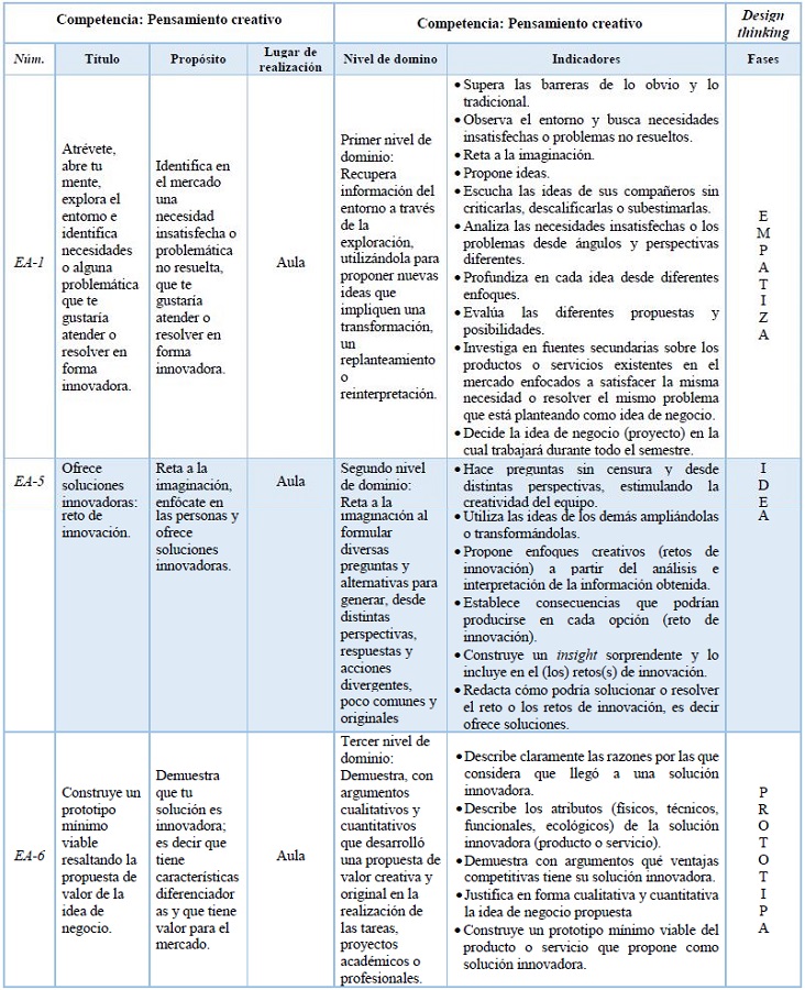 Con la intención de identificar y evaluar, en los estudiantes, el nivel de dominio de la competencia de pensamiento creativo, se establecieron un total de 21 indicadores distribuidos en los tres niveles de dominio propuestos (ver tabla 6). Cabe resaltar que las evidencias diseñadas para el desarrollo de esta competencia son la uno, la cinco y la seis (EA-1, EA-5 y EA-6), tal y como se muestra en la tabla 6.