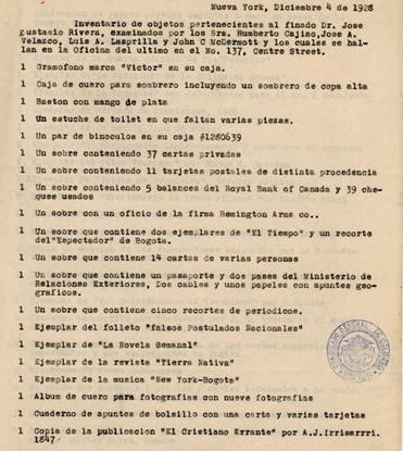 Meses antes de morir, José Eustasio Rivera había rentado un apartamento en la calle 73 N. 114 West, en Nueva York, que le servía a la vez de hogar y de oficina. Allí dejó sus objetos personales después de aquella última noche decembrina. Para entonces, José A. Velasco era su amigo más cercano en esa ciudad y, por tanto, quien se encargaría de inventariar las pertenencias de Rivera. Del consulado colombiano en Estados Unidos enviaron dos delegados, Luis Laspriella y Humberto Cajiao, para certificar el inventario de los haberes del fallecido escritor en su última residencia.1 El acta, con borrador a mano en español y en inglés, y varias copias mecanoscritas, dejó testimonio para la posteridad de las pertenencias del difunto, como se puede ver en la siguiente fotografía: