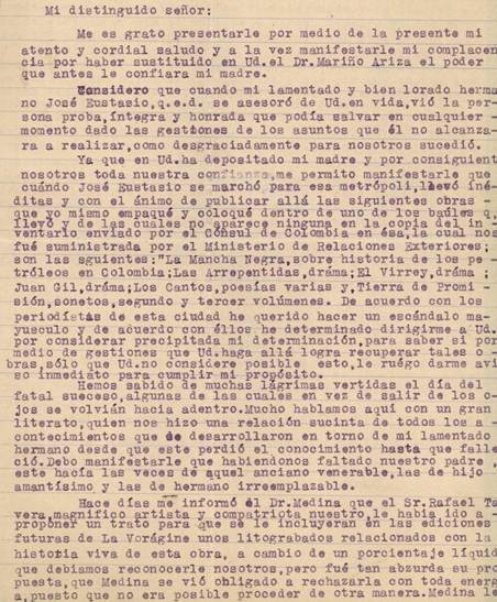 […] me permito manifestarle que cuándo José Eustasio se marchó para esa metrópoli, llevó inéditas y con el ánimo de publicar allá las siguientes obras -que yo mismo empaqué y coloqué dentro de uno de los baúles que llevó y de las cuales no aparece ninguna en la copia del inventario enviado por el cónsul de Colombia en ésa, la cual nos fue suministrada por el Ministerio de Relaciones Exteriores; son las siguientes: “La Mancha Negra, sobre historia de los petróleros en Colombia; Las Arrepentidas, dráma; El Virrey, dráma; Juan Gil, dráma; Los Cantos, poesías varias y, Tierra de Promisión, sonetos, segundo y tercer volúmenes” (carta de Luis Enrique Rivera, julio 31 de 1929).