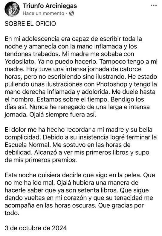 Hicimos esta entrevista en abril de 2023, en el hotel de Corferias, con un ruido infernal alrededor. Estuvimos hablando largo rato como comadres chismosas, cabeza con cabeza, muertos de la risa. Triunfo venía al lanzamiento de Muertas de amor y se veía realmente feliz. Nos conocemos desde hace muchos años, y aunque nos vemos poco, nunca hemos dejado de estar en contacto. Triunfo me manda mensajitos de vez en cuando diciéndome que me quiere mucho, y yo le contesto diciéndole que lo quiero más. Todavía recuerdo el júbilo de leer el manuscrito de lo que después sería La silla que se le perdió una pata. Leer a Triunfo, en sus múltiples registros, sigue siendo una iluminación.