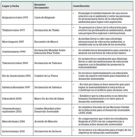 En la Tabla 1 se aprecian los encuentros y declaraciones que la colectividad académica ha realizado en el mundo para hacer tangible la sustentabilidad mediante la educación.